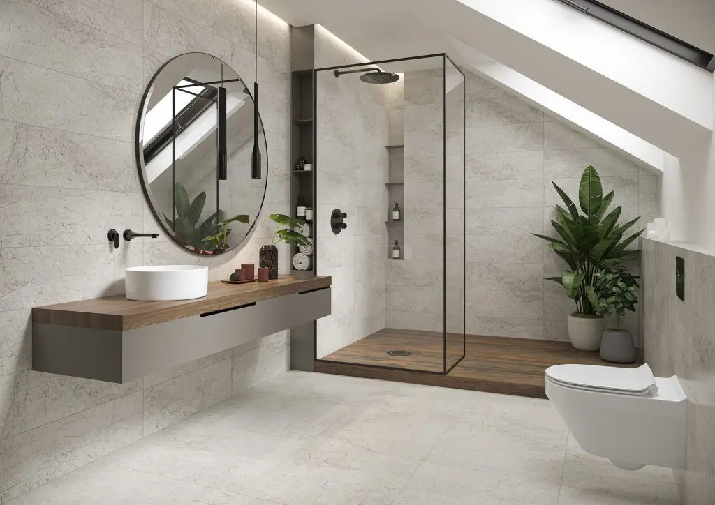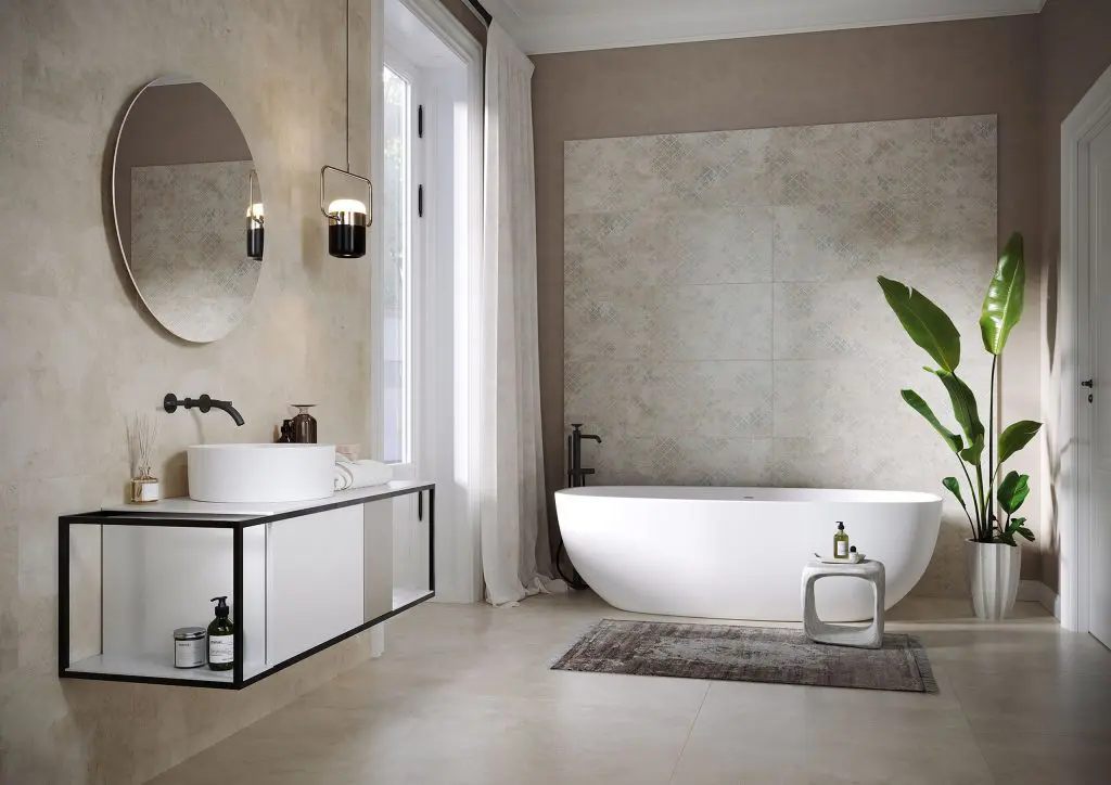 Wzór kamienia naturalnego nieodłącznie kojarzy się z łazienką w stylu klasycznym. Wbrew pozorom taka stylistyka wcale nie jest zarezerwowana tylko dla dużych pomieszczeń. Chcąc wykorzystać płytkę ze wzorem kamienia w małym wnętrzu, należy postawić na jasne, lekkie płytki, których rysunek będzie subtelny, dzięki czemu optycznie powiększymy przestrzeń. Klasyczny klimat w małej łazience możemy z powodzeniem wykreować sięgając po płytki ścienne (24×74 cm) i podłogowe (60×60 cm) z kolekcji Meer. To pełna witalności interpretacja szarego kamienia. Drobne czarne żyłki meandrujące na jasnoszarym tle tworzą niezwykle naturalny i intrygujący rysunek. To także propozycja dla zwolenników łączenia klasyki z nowoczesnością. Płytki Meer będą świetnie komponować się z prostymi formami wyposażenia. Jeśli okrągłe lustro to jeden z naszych must have, dobrze wybrać wersję XXL. Lustra dodają przestrzeni, przez co odgrywają niebagatelną rolę w niewielkich pomieszczeniach. Zwłaszcza, jeżeli umieścimy je naprzeciwko siebie. Uzyskamy efekt lustra w lustrze, dzięki czemu pomieszczenie zyska wyjątkową głębię i będzie sprawiało wrażenie większego. Istotne jest również właściwe oświetlenie. Jeżeli w naszej małej łazience nie ma okna, zadbajmy, aby chociaż jedno źródło światła miało barwę zbliżoną do światła dziennego.