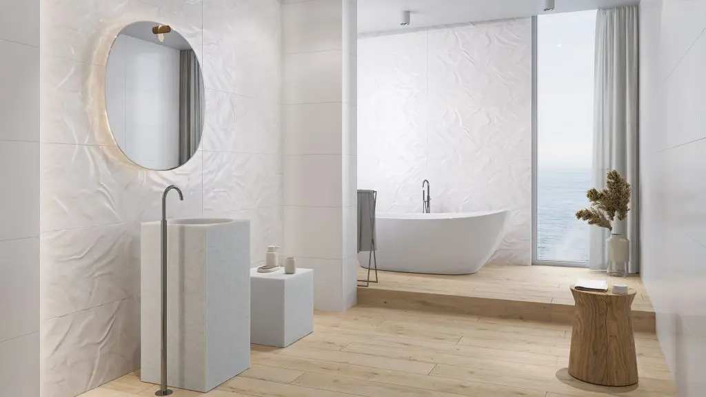 Biała łazienka to aranżacyjny klasyk. Zastosowanie białych płytek ściennych to jeden z najpopularniejszych sposobów na optyczne powiększenie wnętrza. Oryginalnie zaprezentują się płytki z dekoracyjną strukturą z portfolio Opoczno, które dodatkowo poprzez swój wydłużony, a dosyć wąski format 40×120 cm sprawią wrażenie większej powierzchni ścian. Płytki Frozen Lake są inspirowane nieregularną taflą zamarzającego jeziora. Delikatne załamania, miękkie linie oraz satynowe szkliwo stanowią o ich subtelnym uroku. Łącząc je z płytkami podłogowymi o wzorze drewna stworzymy aranżację łazienki w stylu skandynawskim. Taka konwencja sprawdzi się w małej łazience dla rodziny. Aby optymalnie wykorzystać niewielką przestrzeń wybierajmy rozwiązania „2 w 1”, o podwójnej funkcji. Różne potrzeby domowników, zarówno zwolenników długich kąpieli w wannie, jaki i amatorów szybkiego prysznica, pogodzi wanna z przezroczystym parawanem ze specjalnego szkła. Gdy z łazienki korzysta kilka osób, bardzo ważna jest też kwestia przechowywania. Zamiast lustra nad umywalką zamontujmy szafkę z lustrzanymi frontami, która dodatkowo pomieści wszystkie drobne przybory toaletowe i kosmetyki. Ciekawym pomysłem jest też gotowa zabudowa wanny ze schowkami. To panel montowany w przedniej części wanny, wyposażony w kilka otwieranych uchylnie szafek z miejscem do przechowywania ręczników, kosmetyków czy detergentów.