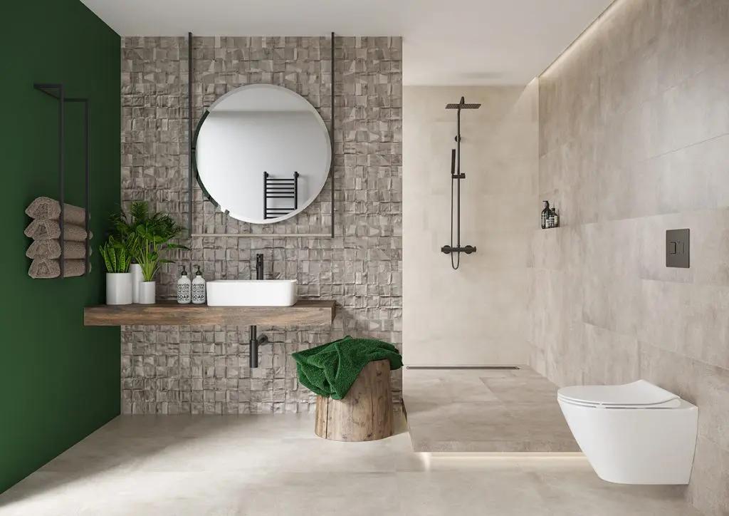 Minimalizm to niezawodny kierunek w przypadku urządzania małej łazienki. Chłodne barwy, surowe powierzchnie i dekoracyjna powściągliwość zapewnią nawet niewielkiemu wnętrzu przestronny charakter. Dobrym punktem wyjścia będę płytki Nerina Slash (ścienne 30×90 cm i podłogowe 60×60 cm) z rysunkiem betonu z wyraźnymi przetarciami, zaciekami i ubytkami, w klasycznej cementowej szarości, a także w kolorach ivory oraz taupe. Zrezygnujmy z montażu typowej kabiny prysznicowej. Urządzenie prysznica w otwartej wnęce pozwoli zaoszczędzić miejsce. Zamiast brodzika wybierzmy odpływ liniowy montowany w posadzce. Jednolita podłoga, wykończona tym samym materiałem na całej powierzchni, wizualnie będzie wydawać się większa. Praktycznym patentem w małej łazience jest wykorzystanie powierzchni ścian. Dobrze zamocować na nich uchwyty na ręczniki oraz półeczki na akcesoria. Z kolei zamiast upiększających dodatków, które zajmują miejsce, lepiej wybrać przyjemne dla oka okładziny. Strukturalna dekoracja Nerina Slash Inserto imitująca mozaikę drobnych kostek będzie niebanalną ozdobą ściany nad umywalką. Mocny akcent kolorystyczny także optycznie powiększy wnętrze. Do szarych płytek doskonale będzie pasować soczysta zieleń, zatem farbą w tym kolorze pomalujmy jedną ze ścian lub jej fragment.