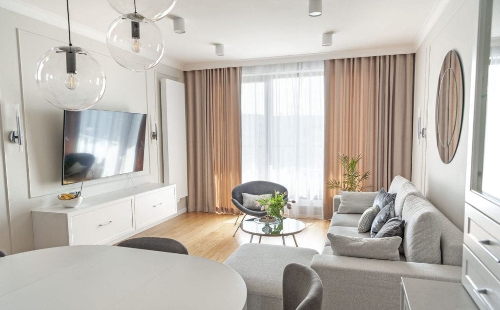 Domownicy szczególnie polubili zrobioną na zamówienie wygodną trzyosobową sofę (Rafek Meble). Jej częścią jest mobilny puf, który może być oddzielnym siedziskiem, dodatkowym stolikiem lub po dostawieniu do sofy, tworzyć miejsce do wypoczynku na leżąco. Nad sofą zawisło okrągłe lustro, które nawiązuje do stolika kawowego z okrągłym lustrzanym blatem. Naprzeciwko kanapy zaprojektowano ścianę medialną – płaski telewizor zawieszono w obramowaniu ze sztukaterii. Podobne ramy zyskał biały panelowy grzejnik. Pod telewizorem pojawiła się wisząca, praktyczna szafka. W tej biało-szarej scenerii nie da się nie zauważyć ciepłych zasłon w beżowym odcieniu. Są one wisienką na torcie całej aranżacji. Ich kolor z pewnością nie był przypadkowy, gdyż pięknie współgrają z odcieniem podłogi.